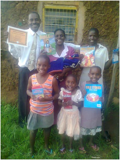 Pastor Erustus and his family: Pastor Sarah holding baby Shirley, and in the front starting on the left: Happy, Gift and Faith standing outside the painted church.