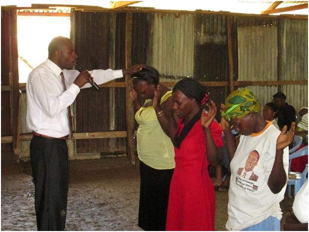 Pastor Erustus laying hands on and praying over church members.