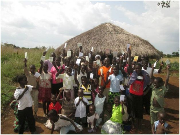Members of the Ugandan church with tracts in their hands, that they are very happy to receive.
