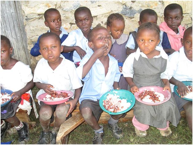 His ministry helps these children with food; School children eating red beans and rice for lunch.