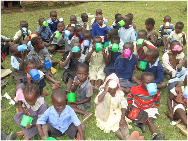 School children having something to drink at lunchtime.